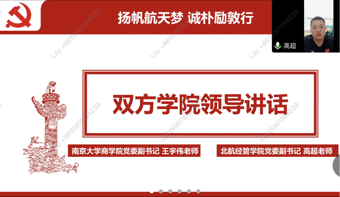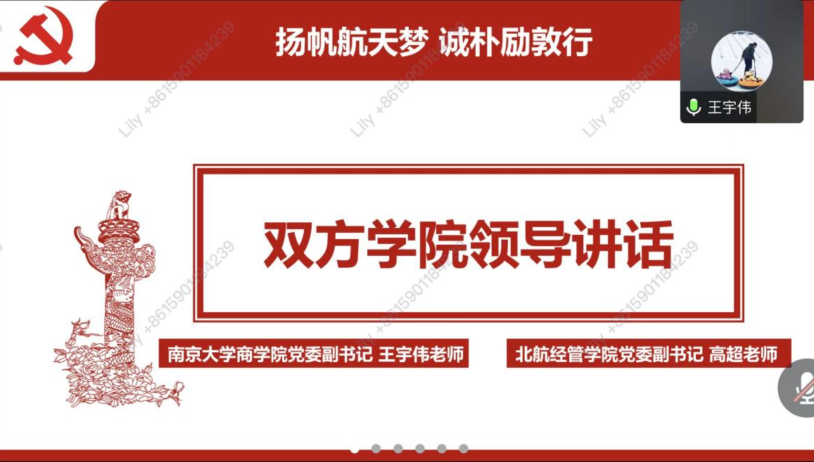 王宇伟老师在讲话中指出,当前全党上下正在热学热议习近平新时代中国特色社会主义思想,身为党员要不断提升自己的思想觉悟,做到知行合一。关于主题教育,要拓宽学习渠道,加深思考和领悟,共建共学是一个很好的方式。他表示,北航的经管专业发展迅速,与南京大学商学院在很多方面都可以进行交流,希望日后可以将活动从线上延伸到线下,通过实地参访加深两校友谊,实现共同进步。