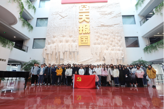 同学们在“空天报国”主题雕塑前集合,正式开启北航校史馆的参观。