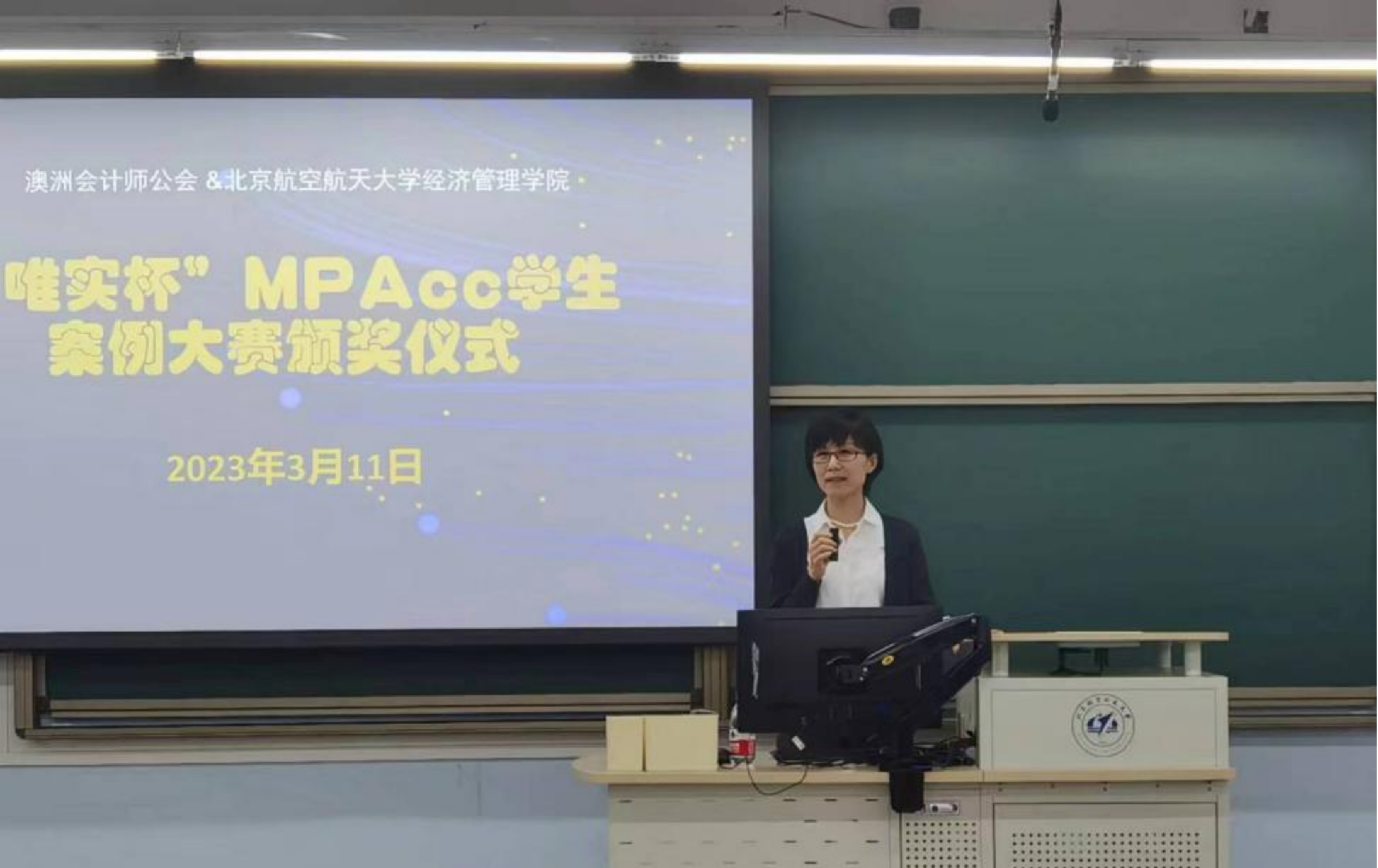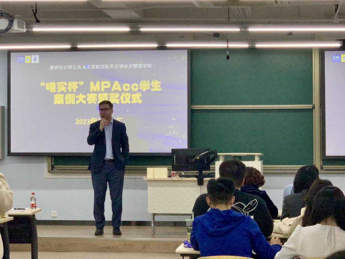 “向阳草木青,明媚春光暖,春天的美,俯拾皆是。”3月11日晚,北航经管学院“唯实杯”MPAcc学生案例大赛颁奖仪式在学院路教学区5号楼112教室隆重举行。2021级、2022级MPAcc研究生共百余人参加活动,澳洲会计师公会北京代表处首席代表孟文静女士、华北区委员会会长彭飞先生、财政部中国注册会计师协会国际及港澳台事务部主任宋祉健先生、中国铁建财务有限公司副总经理薛志辉先生、北京奔驰汽车有限公司战略与内部控制高级经理左晓帆女士、北航beats365亚洲体育投注副院长牟晖副教授、周宁教授、MPAcc教育中心副主任任晖老师出席颁奖仪式。仪式由beats365亚洲体育投注MPAcc教育中心主任白明副教授主持。