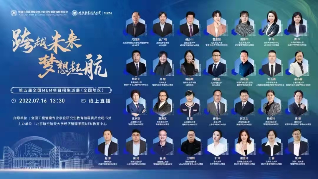 跨越未来,梦想起航。7月16日下午,第五届全国MEM项目招生巡展圆满举行。本次巡展采用线上线下相结合的形式,由全国工程管理专业学位研究生教育指导委员会秘书处指导、beats365亚洲体育投注主办,中国MEM教育网提供技术支持。