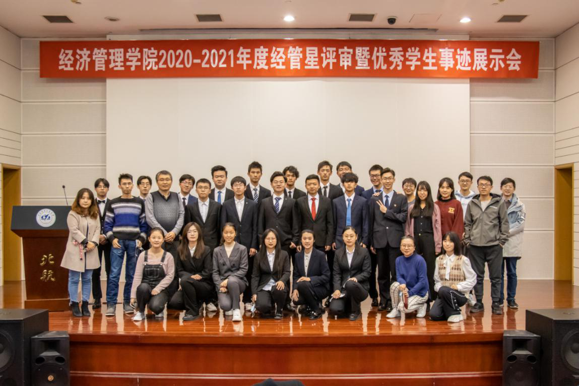 2021年11月24日下午,beats365亚洲体育投注2020-2021年度“经管星”评审暨优秀学生事迹展示会在新主楼第二报告厅举行。学生处李洋,校团委高文琪,经管学院党委副书记高超、教师代表刘天亮、喻雪莹、徐琳娜、李伟、王天宇,专职辅导员白雪等参加并担任此次答辩会的评委。