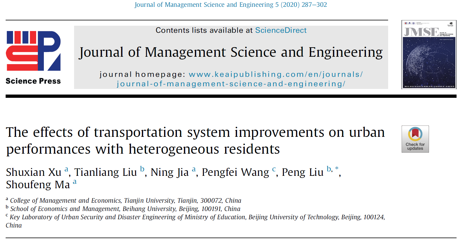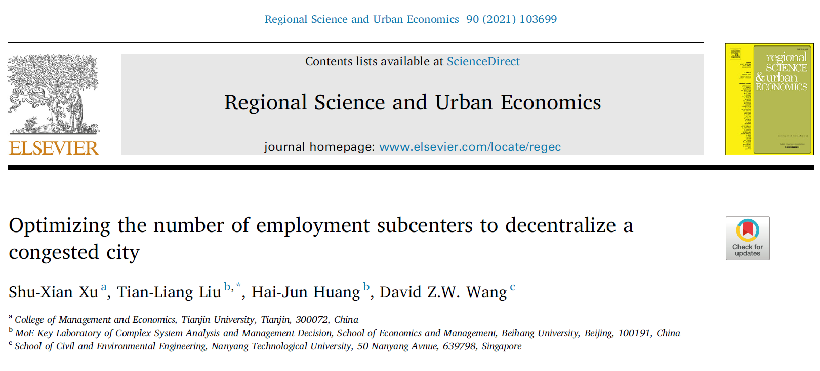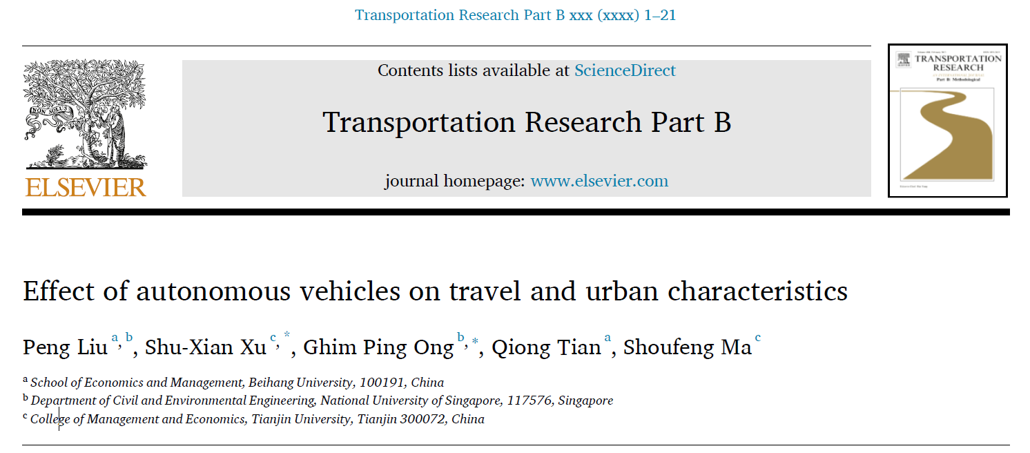 2020年至2021年,我院交通管理研究团队黄海军教授、田琼教授、刘天亮教授、刘鹏副教授与天津大学徐淑贤助理教授、新加坡国立大学Ghim Ping Ong副教授等合作者在城市经济学领域取得一系列创新性成果。相关研究发表于交通运输、运筹管理、城市经济期刊《Transportation Research Part B: Methodological》、《Journal of Management Science and Engineering》(管理科学学报英文版)、《Regional Science and Urban Economics》等。