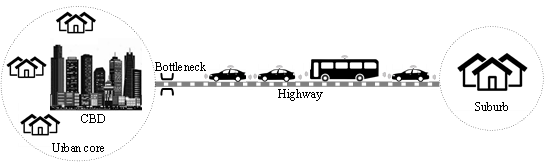 图1.A simple core-suburb city structure with on-demand and frequency-basedAVs.