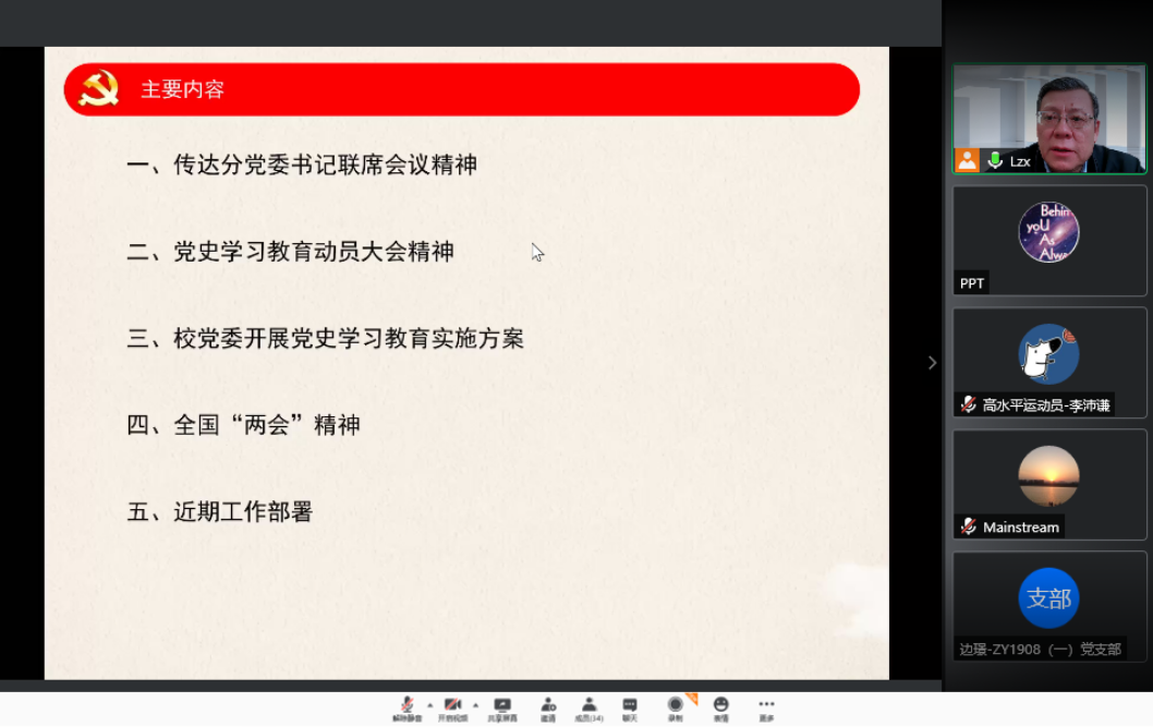 2021年3月31日下午16时,beats365亚洲体育投注以视频形式召开支部书记联席会,传达学校分党委书记联席会精神,学院分党委书记刘志新主持会议,全体师生党支部书记、学生工作负责人和专职组织员30余人参加会议。