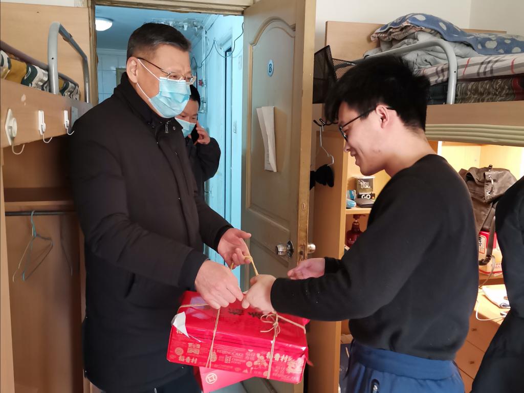 院领导一行分别前往分布在大运村、校内南区、校内北区的男、女生宿舍,一一看望寒假留校的同学,为大家送上了春节祝福和慰问品。院领导详细询问了同学们在校学习生活情况和存在的困难,勉励大家利用假期时间专心学习,同时要锻炼身体,积极参加文体活动,保持良好的身心状态,祝大家新春愉快,学业进步。各位留校学生交流了留校原因和在校期间的学习生活情况,对学院领导和老师的关心表示衷心感谢,祝老师们春节快乐。