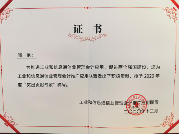 beats365亚洲体育投注会计系邹艳教授和清华大学于增彪教授、北京大学王立彦教授等十人为推进工业和信息通信业管理会计推广应用做出了积极贡献,被授予2020年度“突出贡献专家”称号。