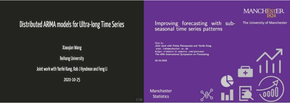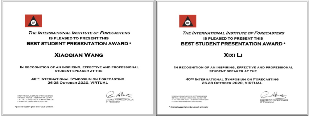 本次会议聚集了来自54个国家的634名参会者,共有325场精彩的学术报告。王晓倩的学术报告题目为“Distributed ARIMA models for ultra-long time series”,该论文提出了一种大数据时代下如何改进传统统计方法以适应超长时间序列的分布式参数优化和预测方法,获得最佳学生报告奖的第一名,由Monash大学、Amazon、Google等资助。李茜茜的学术报告题目为“Improving forecasting with sub-seasonal time series patterns”,该论文提出一种利用子季节模式有效应对模型和参数不确定性的预测方法,获得最佳学生报告奖的第二名,由Monash大学资助。两位所在分会场共吸引了200余名预测专家学者参加。他们的个人主页和会议学术报告地址如下: