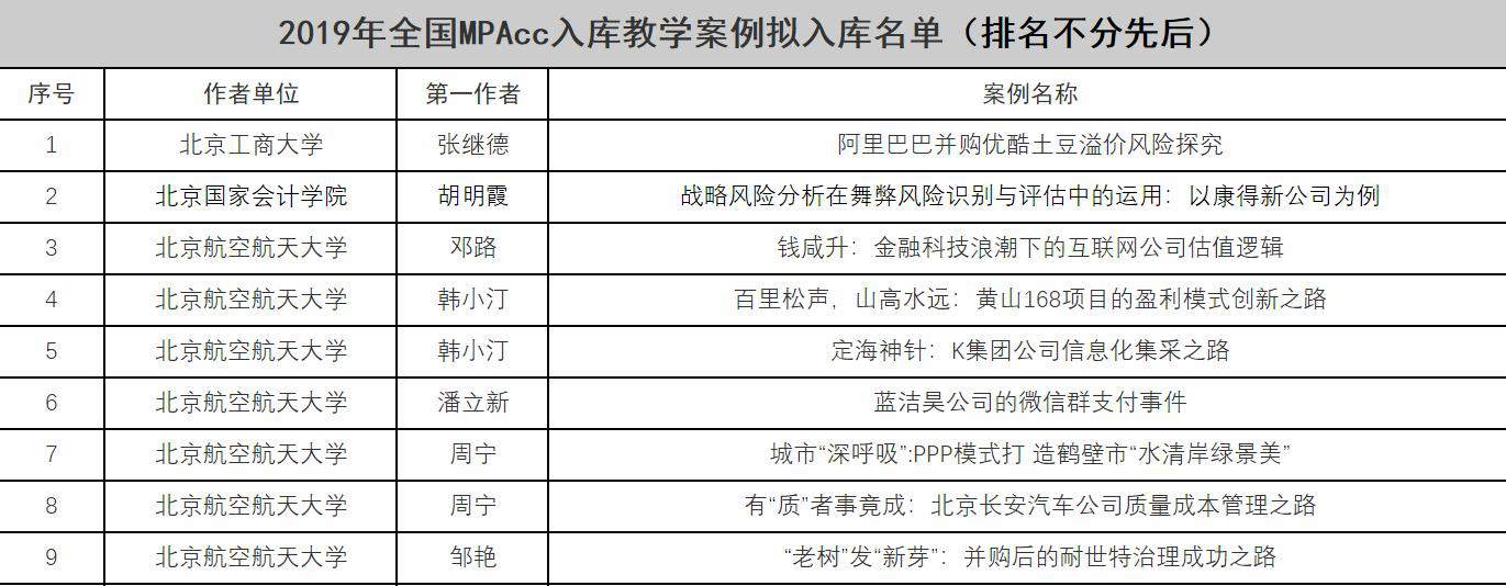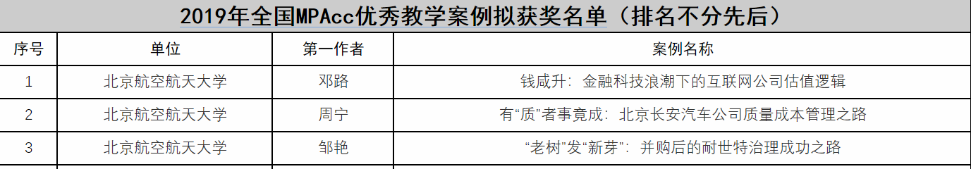 近日,2019年全国MPAcc优秀教学案例、入库教学案例拟获奖名单公布,beats365亚洲版官网经管学院推荐的参评案例中,共有三篇案例获奖,七篇案例入库,并首次获得全国优秀组织奖。本次MPAcc优秀教学案例评选,全国高校共计申报730余篇教学案例,经过全国会计专业学位研究生教指委组织的形式审查、匿名通讯评审、线上会议集中评审,最终评选30篇全国MPAcc优秀教学案例,经管学院获奖案例数占总获奖篇数的10%,展示了经管学院持续推动案例开发和案例教学取得的重要成果。