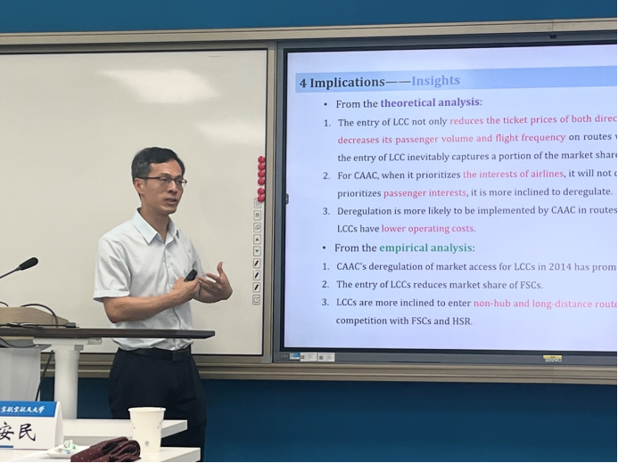 对外经济贸易大学国际经济贸易学院副院长杨杭军教授讨论了低成本航空放松管制对中国航空市场竞争的影响,报告从理论机制、实证经验和政策含义三个方面入手,对我国低成本航空进一步发展提出建议。