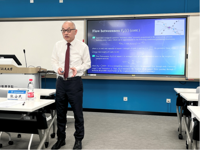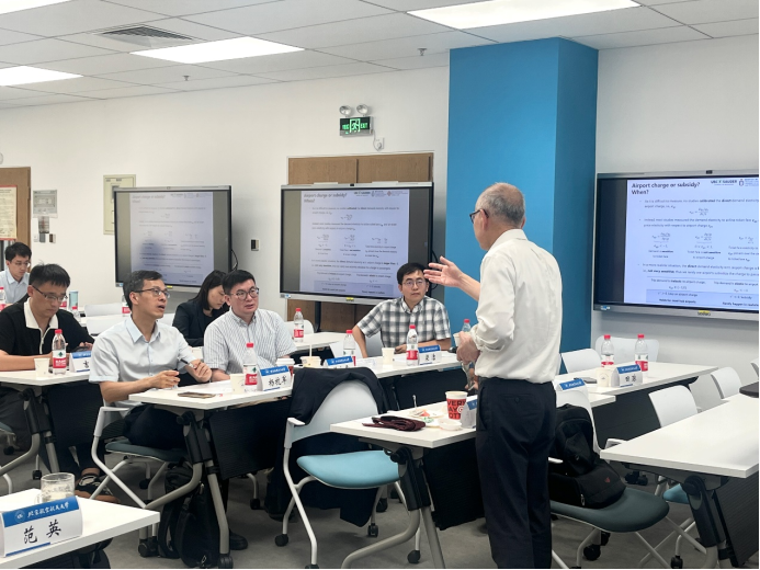 不列颠哥伦比亚大学尚德商学院、世界航空学会(ATRS)主席张安民讲席教授于上、下午分别做了关于机场连接度和韧性的航空大数据分析以及机场收费、容量和建议到达时间为主题的两场主旨报告,并与与会学者充分交流讨论。