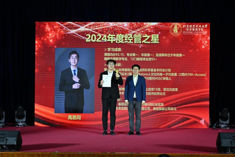 大会第七项,由党委书记郑海涛为经管学院年度最高荣誉“2024年度经管之星”获奖人——2021级本科生高恩同同学颁奖。高恩同同学连续两年成绩排名年级第一,主持首批北京市自然科学基金本科生计划一项,同时作为第一作者发表学术论文2篇(1篇Q1区SSCI A&HCI检索,1篇EI),担任期刊HSSC,会议ACM CHI审稿人。荣获北航本科生最高荣誉“沈元奖章”。