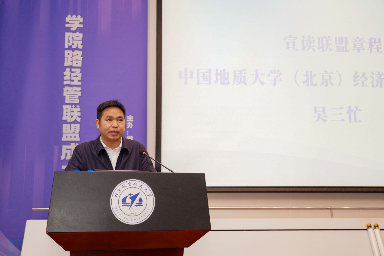 中国地质大学(北京)beats365亚洲体育投注院长吴三忙宣读了联盟章程,明确了联盟的宗旨、性质、组织、职责与权利及联盟成员资格管理等内容,为联盟工作的顺利开展奠定了制度基础。