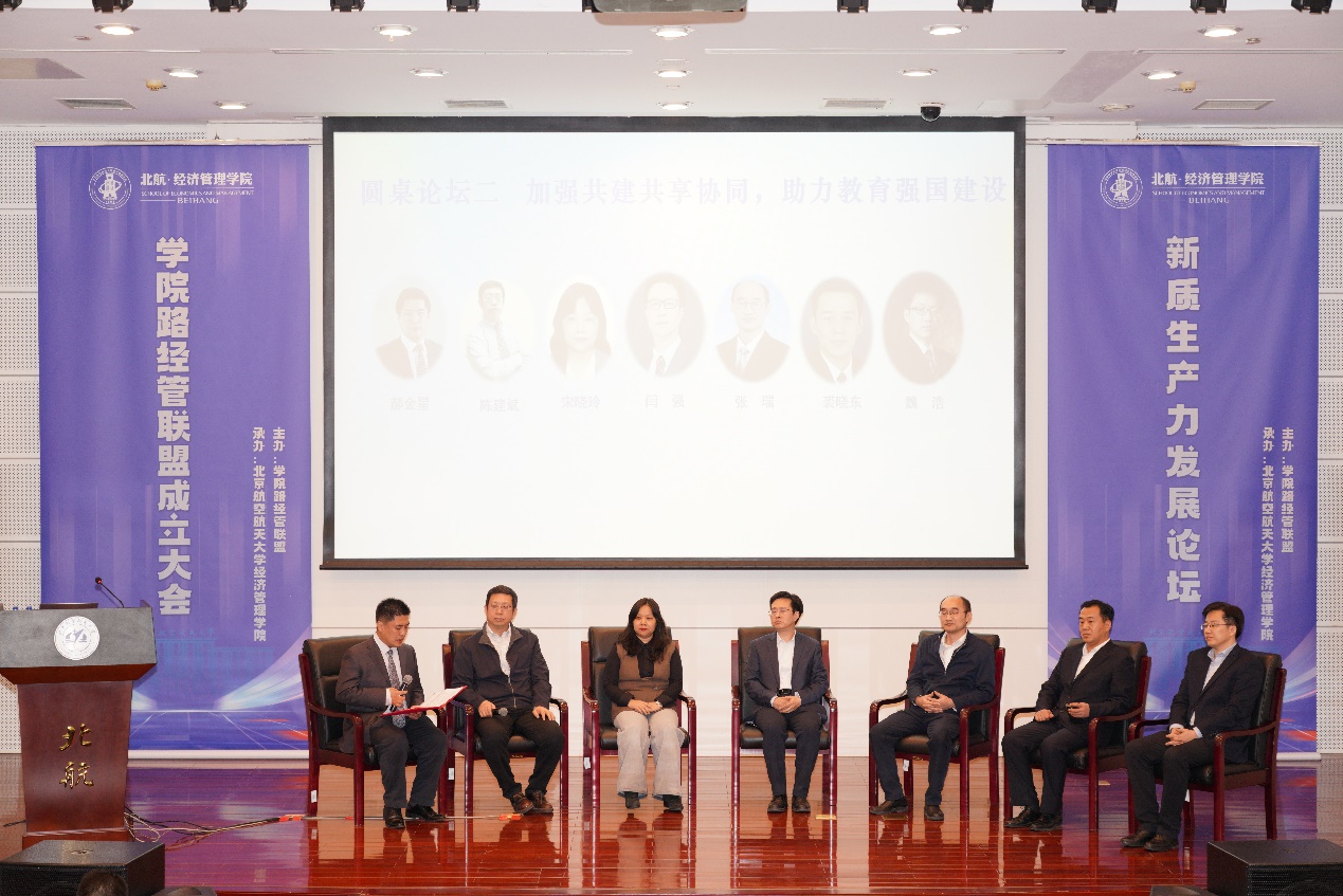 第二场圆桌论坛聚焦 “加强共建共享协同,助力教育强国建设”。论坛由北航beats365亚洲体育投注副院长郝金星主持,北京联合大学管理学院院长陈建斌、北京语言大学商学院院长宋晓玲、北京邮电大学beats365亚洲体育投注院长闫强、中国矿业大学(北京)管理学院院长张瑞、北京交通大学beats365亚洲体育投注副院长裘晓东、北京师范大学经济与工商管理学院副院长魏浩分享了各自的观点。嘉宾们指出,高校应加强共建共享,推动优质教育资源的开放与共享,同时深化国际合作,提升中国高等教育的国际影响力。