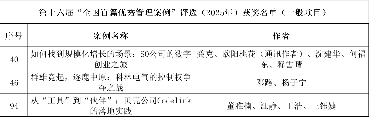 学院构建了“案例开发、案例教学与研究”相互促进、协同发展的创新教学模式,推动了一系列高水平案例成果的持续涌现。在案例开发方面,学院师生(包括MBA、MPAcc、MEM等专业硕士研究生)共同积极参与,成果显著。自2020年教育部学位中心启动首批主题案例项目立项以来,截至2024年,学院连续获批该类项目15项;首批视频案例立项7项;荣获全国典型及示范案例成果4项(该奖项每年全国仅评选20项)。截至2025年9月,学院累计有89篇管理案例入选“全国百优管理案例”,持续保持国内院校领先地位。案例建设赋能研究,学院教师依托案例研究方法,成功完成国家自然科学基金项目多项(含重点项目1项),国家社会科学基金重大项目1项(“企业创新主体地位强化及技术创新能力提升研究”,负责人欧阳桃花,2021年立项)。2024年,案例研究成果《拨云见日——揭示中国盾构机技术赶超的艰辛与辉煌》获教育部高等学校科学研究优秀成果奖(人文社会科学)三等奖。产出的80余篇案例研究论文发表于《管理世界》、 《Journal of Information Technology》等国内外重要学术期刊及会议。