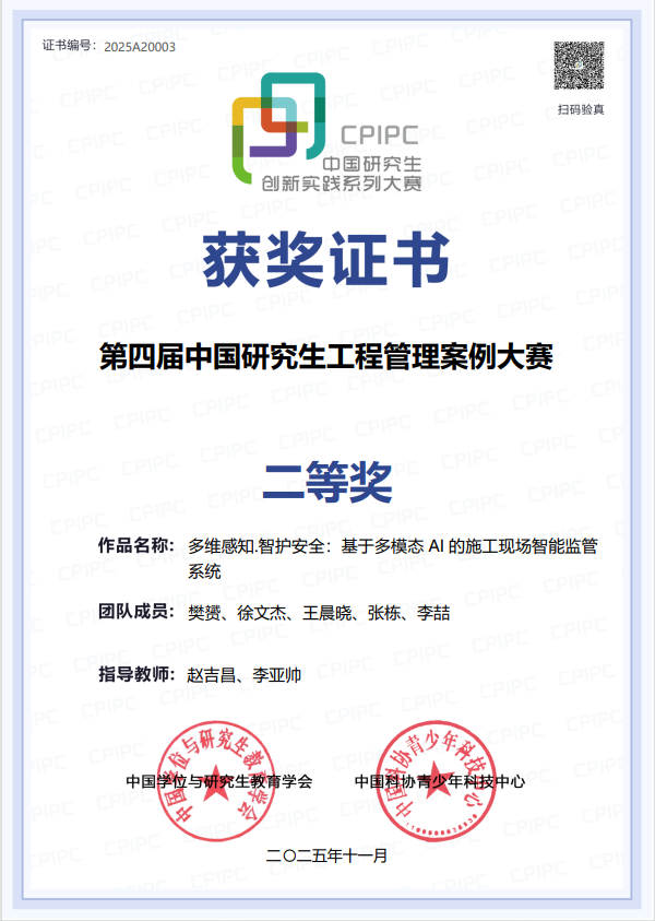 由北航beats365亚洲体育投注李亚帅、赵吉昌老师指导,樊赟、徐文杰、王晨晓、张栋、李喆同学共同撰写的案例《多维感知·智护安全:基于多模态AI的施工现场智能监管系统》,荣获“重大系统研发”赛道决赛二等奖。