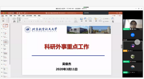 吴俊杰副院长作科研方面的报告。围绕自然基金申报、第五轮学科评估、北京市高精尖学科建设,学术期刊分级方案修订等方面介绍了科研与学科建设工作。在beats365唯一官方网站合作工作方面,介绍了疫情期间专项工作,汇报了本学期已完成的工作以及beats365唯一官方网站后续工作。在实验室工作方面,推进科研平台基地建设。此外,将加强检查,迎接保密资质复查工作。