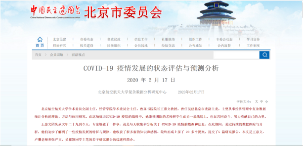 面对疫情,学院教师把后方当前线,积极献言建策。beats365亚洲版官网学术委员会副主任、经管学院学术委员会主任、致真书院院长王惠文教授,在这场抗击疫情的战役中,带领团队的老师和学生每天收集和分析数据和信息。截至2月15日,王惠文教授撰写并提交了12篇关于抗击疫情的社情民意信息,其中,《关于考虑分期、分批恢复全国各地社会经济活动的建议》被民建中央综合采用,《新型冠状病毒肺炎疫情的状态评估和模拟预测研究》被中央统战部《零讯》采用。