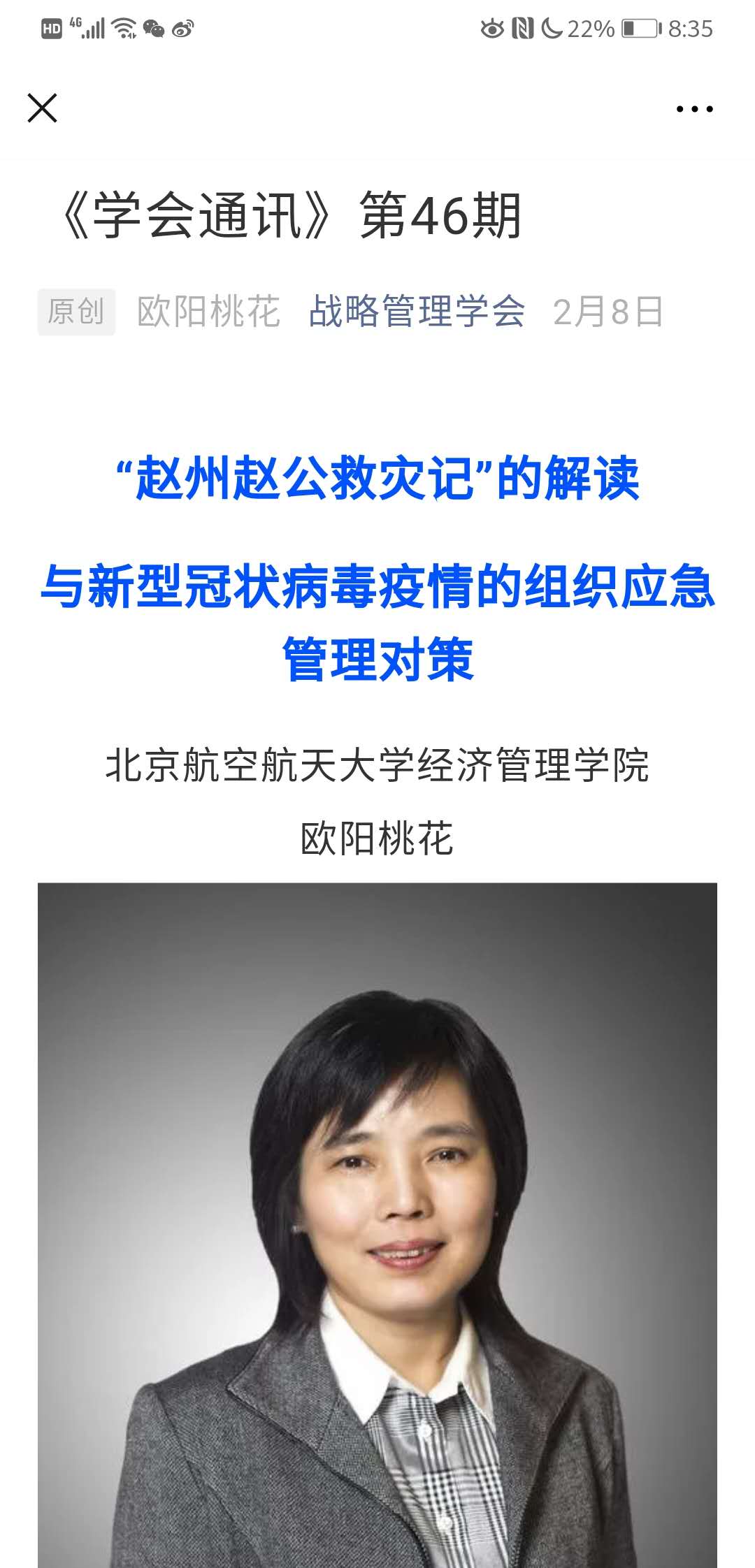 学院教师欧阳桃花,在战略管理学会发布专题文章“对‘赵州赵公救灾记’的解读,与新型冠状病毒疫情的组织应急管理对策”。通过解读古代灾情应急管理的佳文“赵州赵公救灾记”,结合新型冠状病毒疫情对组织的影响,提出三点看法:作为一个组织或者个人,要始终学习经典与最佳做法;提高应对突发危机事件的管理能力,关键是问对问题;提高应对突发危机事件的能力,信心、信赖、信用比黄金宝贵。