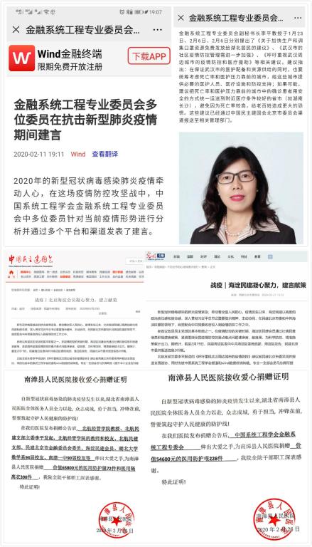 我院李平教授通过民建北京市委报送了《关于加快生产和调集口罩资源免费发放给湖北居民的建议》、《呼吁重视武汉周边城市的疫情防控和医疗援助》、《武汉市的社区疫情防控管理需进一步加强》等建言献策报告。其中,报告《呼吁重视武汉周边城市的疫情防控和医疗援助》被民建北京市委采纳,并报送全国政协。综合成果先后被中国系统工程学会官网、Wind资讯、民建中央官网、光明网报道或转载。除了建言献策外,李平教授还发起了募捐活动(我院多名校友和教师参与了其募捐活动),并在医护用品紧缺和物流困难的时间段,用募集到的6万多元捐款,千方百计购买了400多件医用防护服,寄给湖北省襄阳市南漳县人民医院(二级甲等肺炎定点医院)。此外,她还在武汉疫情最严重、好多重症病人不能住院的时间段,帮助武汉市三个辗转求助的陌生重症病人联系住进医院。她的这些工作近日被北京时间和光明网等媒体报道。