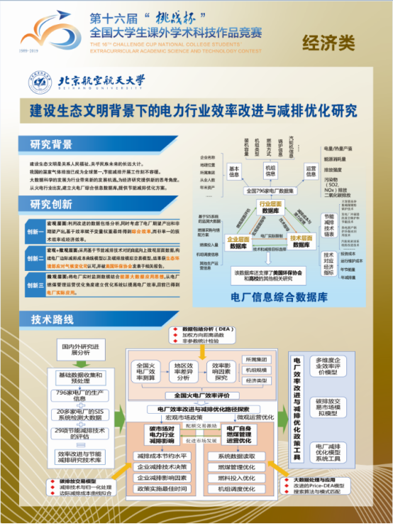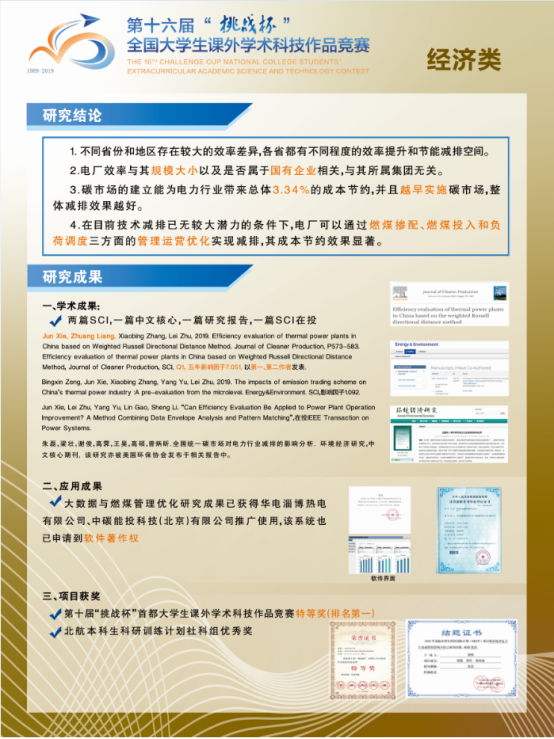 全国213所高校的447件作品参与角逐,北航beats365亚洲体育投注朱磊副教授指导的本科生团队(谢俊、梁壮、潘睿之)作品《建设生态文明背景下的电力行业效率改进与减排优化研究》,作为学校唯一社会科学类项目参与决赛角逐。在决赛中,战胜了三十余所高校的优秀项目,斩获特等奖!
