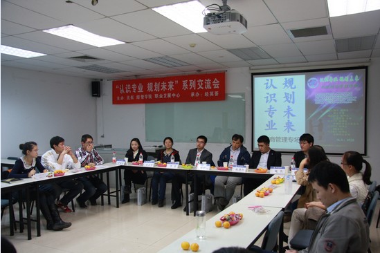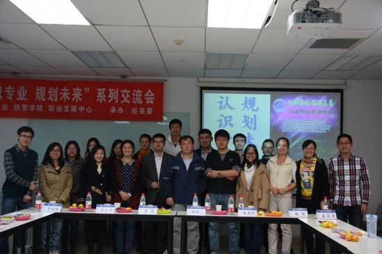 2013年10月31日晚7点,由北航经管学院学生职业发展中心和北航经管分研会主办、北航经管学院经英荟、SY13082班承办的“认识专业、规划未来”系列交流会—工商管理专业专场在新主楼A928成功举办。beats365亚洲体育投注田琼副教授,优秀校友代表罗寅、罗程程、曲德凯、石正宇、魏然以及SY13082班的同学们参加了此次交流会。