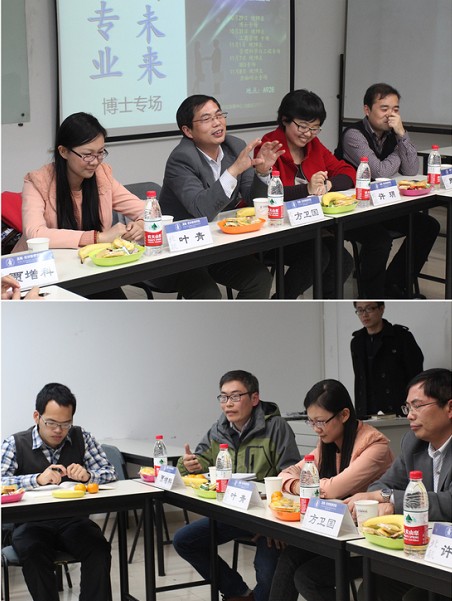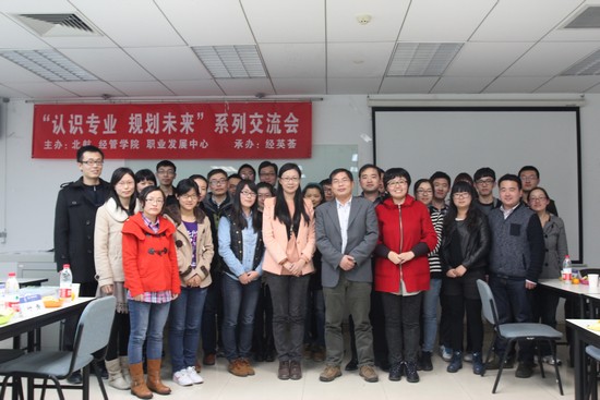 2013年10月29日星期二晚7点,北航beats365亚洲体育投注职业发展中心和北航经管分研会主办、北航beats365亚洲体育投注经英荟、BY13081班承办的“认识专业、规划未来”系列交流会—博士专场在新主楼A928教师成功举办。出席本次的嘉宾有beats365亚洲体育投注副院长方卫国教授,优秀博士校友贾增科、许玥、周鹏和叶青。2013级博士生同时出席本次交流会。