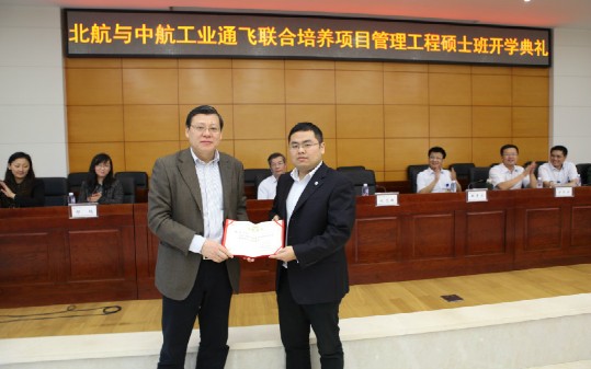 开学典礼上,北航经管学院党委书记刘志新教授为通飞工程硕士学生孙炫颁发了2012级工程硕士新生奖学金。