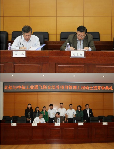 在全体人员奏唱的中华人民共和国国歌歌声中,开学典礼正式开始。刘志新书记和汪波副总经理分别代表北航经管学院和中航工业通飞签订了联合培养2012级项目管理领域工程硕士协议书。