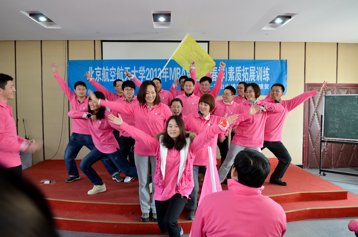 早上7:30学员集合完毕。在行车途中,领队为每位学员赠送了一条魔术头巾,并带领大家一同学习多种头巾穿戴方式:围脖、手机套、汗巾、游泳帽、打劫帽等等。之后每位学员做了自我介绍。经过1小时30分钟的车程,顺利到达目的地。稍作休整后,首先举行了北航2013级MBA课程班学员的破冰起航仪式。学员们在拓展训练教练的带领下,划分为两个团队,并分别为自己的团队起名为“老A”和“钻石”。随后,学员设计了团队宣言、队旗、队歌等一系列团队活动。通过破冰,学员们相互熟悉,气氛融洽,并期待即将到来的拓展活动。