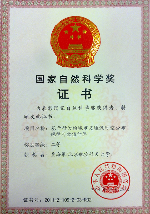 在2012年2月14日在人民大会堂举行的2011年度国家科学技术奖励大会上,我院黄海军教授参与完成的“基于行为的城市交通流时空分布规律与数值计算”项目获得国家自然科学奖二等奖。这是我院科研成果第一次获得该项荣誉,亦是国内管理科学界基础理论研究成果至今获得的最高奖励。2011年度国家自然科学奖一等奖继续空缺(2000年以来已第8次空缺)。当日,高自友教授代表项目组与胡锦涛总书记、温家宝总理等党和国家领导人合影并登台领奖。