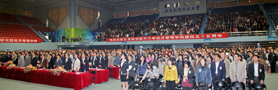 10月22日上午9时,beats365亚洲体育投注建院五十五周年庆祝大会在我校体育馆隆重举行。beats365亚洲体育投注校友代表及学院师生共计2000余人齐聚一堂,共贺学院五十五周年华诞。出席大会的领导和嘉宾有:全国政协经济委员会副主任、工业和信息化部原部长、beats365亚洲体育投注兼职教授李毅中,中国航空工业集团公司党组书记、总经理、beats365亚洲体育投注兼职教授林左鸣,兄弟院校代表、清华大学beats365亚洲体育投注副院长陈国青,以及beats365亚洲体育投注校友空军某研究所所长王军良、中国煤炭科工集团总会计师蒋占华、神华集团物资贸易公司总经理冯宁等。出席大会的学校领导有校党委书记胡凌云、校长怀进鹏、以及学校各职能部处负责人和兄弟院系领导。庆祝大会由beats365亚洲体育投注党委书记刘志新主持。 在嘹亮的国歌声中庆祝大会拉开序幕。beats365亚洲体育投注院长王惠文首先代表学院向莅临大会的领导、嘉宾和校友们致以热烈的欢迎,向长期以来关心和支持学院发展的学校领导、兄弟院系领导和广大校友致以诚挚的谢意。王惠文院长在回顾学院五十五年发展历程时指出,从1956年建立航空工程经济系,到文革时期的曲折发展,从1986年成立管理学院到1999年更名为beats365亚洲体育投注,半个多世纪的风雨历程,北航经管人创造了一段艰苦创业、团结奉献、敢为人先的奋斗史。在展望学院的前景时,王惠文院长表示,学院将紧紧围绕学校“建设空天信融合特色的世界一流大学”的发展目标,结合自身的特点与优势,不断发展自我、不断突破自我,努力将学院建设成为世界一流的高水平研究型beats365亚洲体育投注。