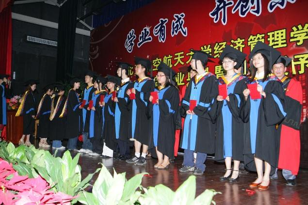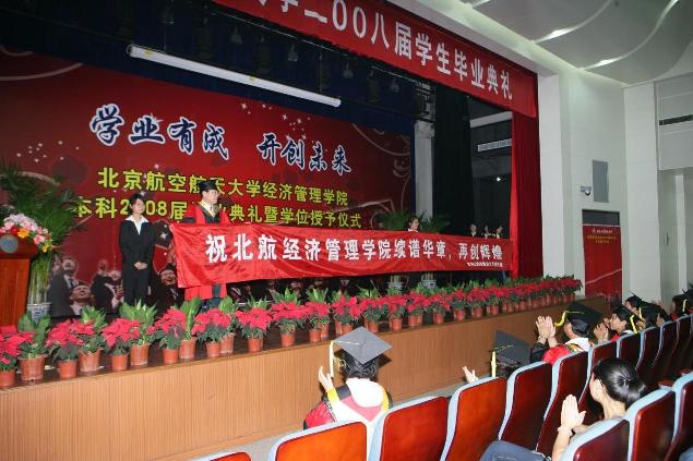 学位授予仪式结束后,刘志新书记宣读北京市和北航优秀毕业生名单,全体出席老师上台为获得北京市和北航优秀毕业生称号的同学颁发证书并合影留念。最后,学生代表向学院赠送了纪念横幅——祝北航beats365亚洲体育投注续谱华章,再创辉煌。毕业典礼场面隆重气氛热烈,在同学和家长热烈的掌声中结束。