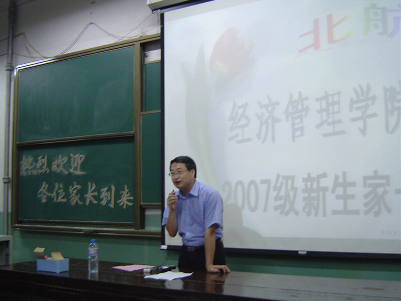 经管学院3708大班新生家长会于主127教室如期举行。经管学院06级的同学提前入场,精心布置了会场。负责引导的同学身着正装,彬彬有礼,服务周到,给各位新生家长留下了极为深刻的印象。家长们在柔和的音乐声中有序进入会场,兴致勃勃地听着我们的工作人员给他们介绍经管学院的悠久历史和优秀人才。会议在热烈的气氛中开始,经管学院姚伟龙书记等院领导作了讲话,向家长们详细地从学院概况、师资力量等各个方面介绍了经管学院。07级辅导员也作了热情洋溢的讲话,表达了对新生的欢迎,也向家长们明确了学院对于新生的各种要求。