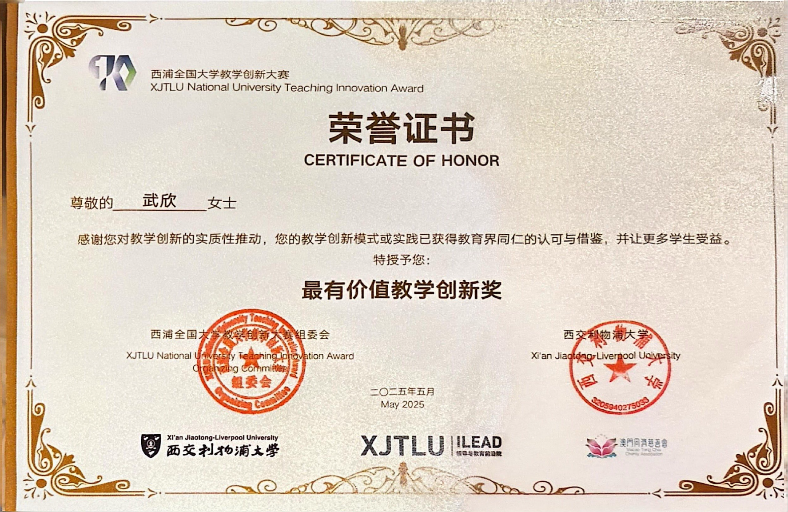 2025年5月18日,西浦全国大学教学创新大赛(简称“西浦大赛”)十周年庆典在苏州西交利物浦大学举行。为了表彰在西浦大赛中,其创新成果不仅在理论上具有前瞻性和创新性,而且在实践中具有可行性和有效性的杰出教学创新者,西浦大赛组委会设立了“最有价值教学创新奖”,经过专家评选,从西浦大赛十年来的获奖选手中选出了11位获奖者。我院武欣老师去年获得西浦大赛特等奖,此次获评“最有价值教学创新奖”。