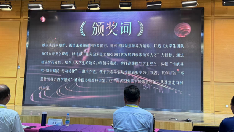 组委会在颁奖词中写道:“她以实践为熔炉,锻造未来领袖的成长秘钥。她和团队聚焦领导力培养,打造《大学生团队领导力开发》课程,以培养服务国家需求和引领时代发展的未来领导人才为目标,通过新生梦拓计划,培养了大学生的领导力和领导素质。她打破课程与学工壁垒,构建‘情感共鸣-知识赋能-行动转化’三维培养链,使千余名学生从受助者蜕变为引领者。其创新的‘场景化领导力教学范式’被全国多所高校借鉴,让服务国家需求的未来领袖从课堂走向时代前沿”。