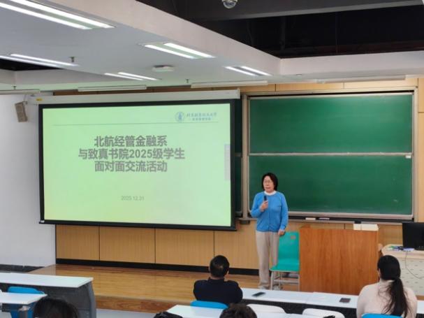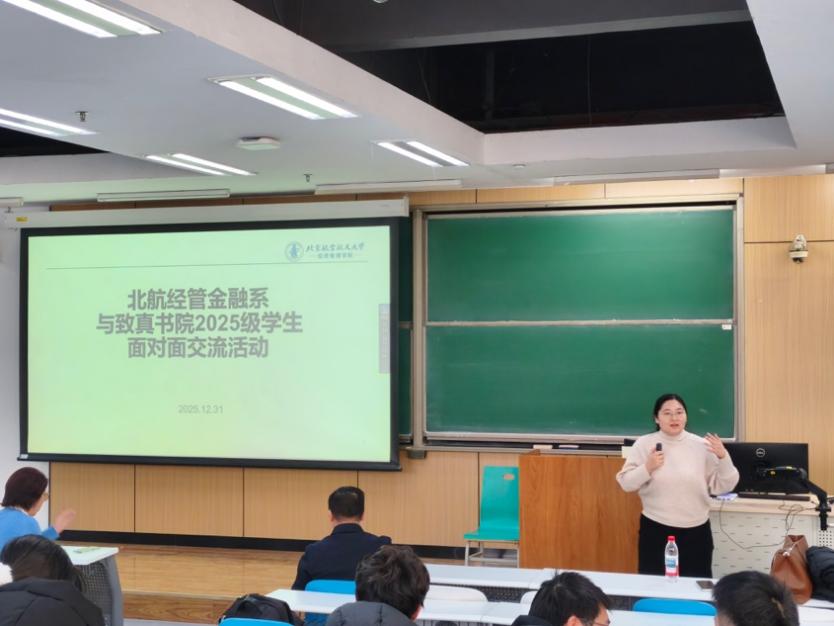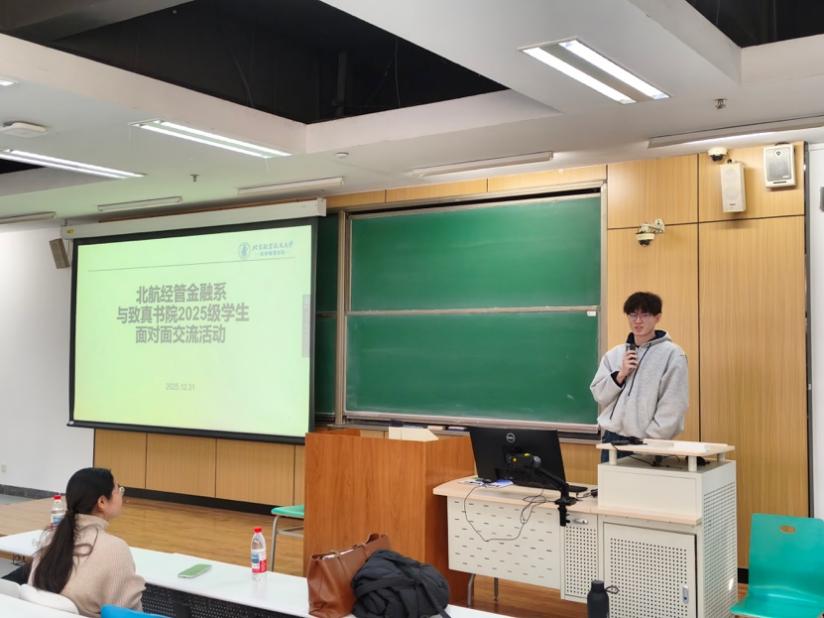 由北航经管金融系召集,由经管学院学生工作办公室和致真书院学生辅导员协助,“北航经管金融系师生与致真书院2025级学生面对面交流活动”于2025年12月31日(周三)下午14:00-15:30在北航沙河校区 J3-105 教室成功举办。本次活动金融系四位老师包括金融系主任部慧副教授、赵尚梅教授、谭小芬教授、大四学生班主任石丽娜博士,以及三位学生包括张婷(2021级保研留在北航金融专硕项目,院级优秀毕业论文)、王泽明(2021级保研留在北航金融专硕项目、能源经济大赛获得北京市二等奖获得者)、甘宇奇(2022级保研直博留在金融系博士生项目、冯如杯主赛道一等奖获得者)参加本次学生活动。