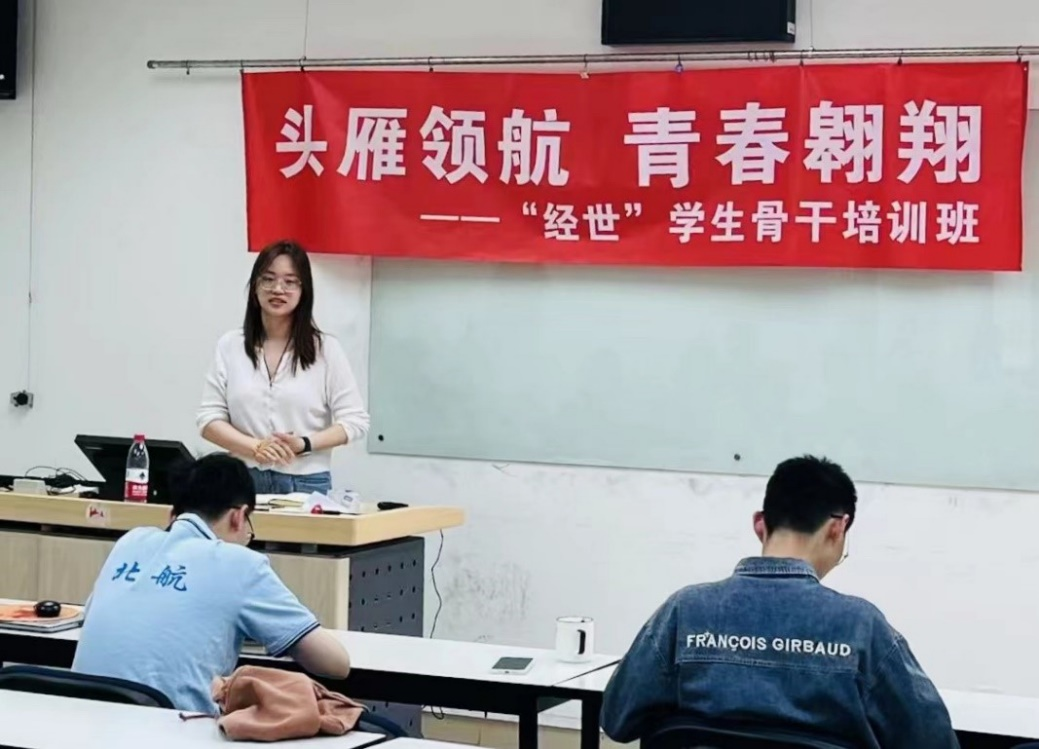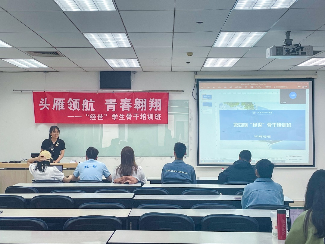 为弘扬空天报国情怀,秉承“尚学敏行、经世至善”院训精神,进一步强化学院学生培养的高质量发展,加强学生骨干的思想引领建设工作,beats365亚洲体育投注于2023年5月6日下午举行以“‘头雁’领航,青春翱翔”为主题的第一期“经世”学生骨干培训班第四课,主要内容为学生工作交流沙龙。学院专职辅导员陶雨芊,兼职辅导员张勋、王心童、尹滢滢及30名学生骨干参加本次课程。