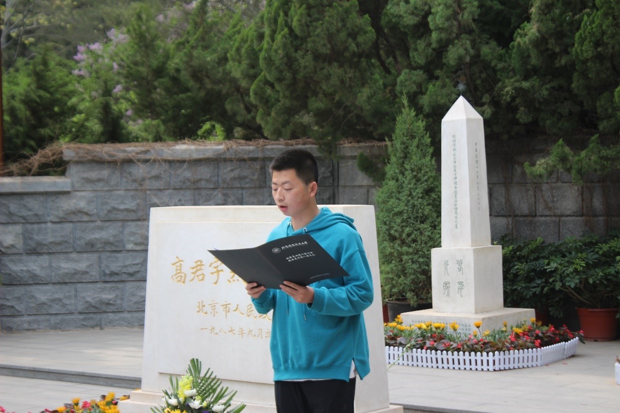 早晨9点,学员们来到烈士墓前,用白花装点周围的苍松翠柏,每一位学员都身着素服,肃立在高君宇烈士墓前。仪式在庄严、肃穆的气氛中开始,全体学员站立整齐,在墓前集体默哀三分钟,随后由学员代表史文鑫为大家介绍烈士的生平事迹,深切缅怀革命先烈的丰功伟绩,弘扬爱国主义精神。