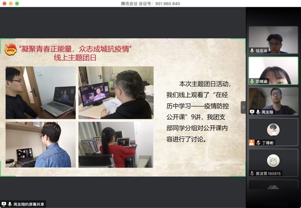 2020年5月24日14:00,1808优秀团支部答辩在腾讯会议平台以线上会议形式举办。此次答辩由1808辅导员丁得彬主持,共有7个团支部参与答辩。答辩特别邀请了1808班班主任王楚男老师、李伟老师,研究生辅导员李达晨、王劲奇,本科生辅导员张园园、朱帅东以及1808团支部14名学生团员代表作为评委,为各个团支部的表现评分。
