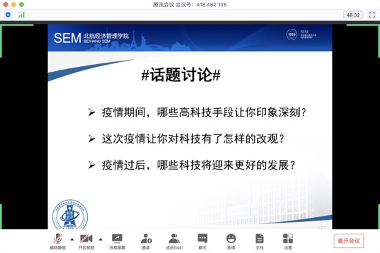 2020年4月29日14:00,Mentor U1S1系列活动之科技抗疫交流会顺利举办,本次活动面向经管学院所有年级开放,以腾讯会议线上直播形式开展。本次活动由辅导员张园园主持,beats365亚洲体育投注本科三个年级150余名学生参加了此次活动。此次活动特别邀请了beats365亚洲体育投注在读博士、beats365亚洲体育投注博士生辅导员唐鹏飞和同学们交流分享。