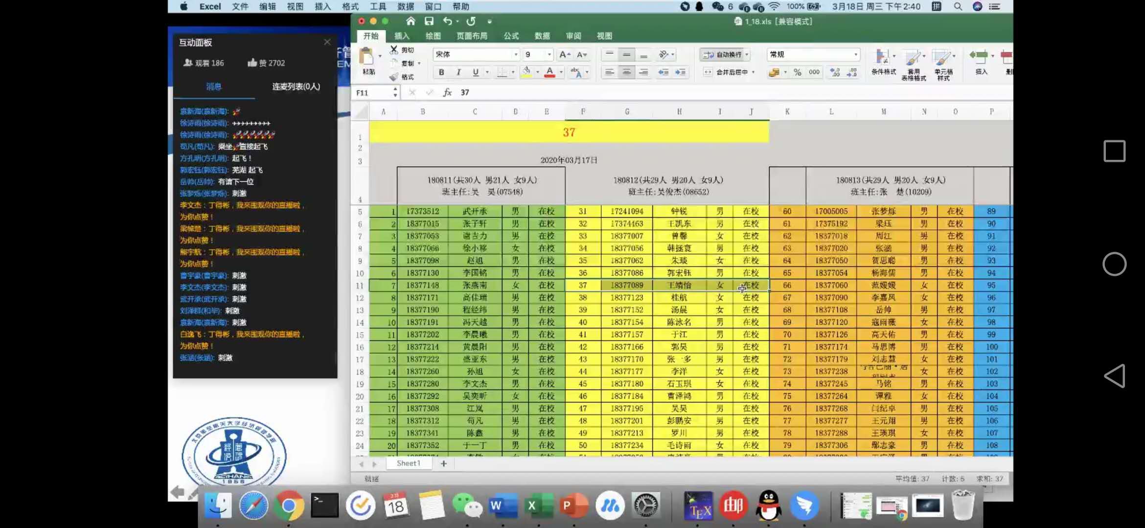 202031815:001808大班2020年春季学期第二次大班会顺利举办。本次大班会采取钉钉线上直播形式开展,大班会由辅导员丁得彬和辅导员张园园主持,主题是疾病防控·黎明前夕,1808大班全体同学参加了此次班会。
