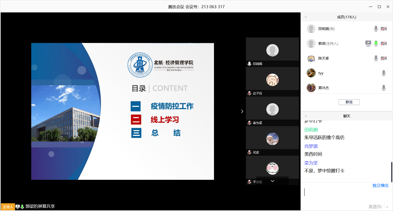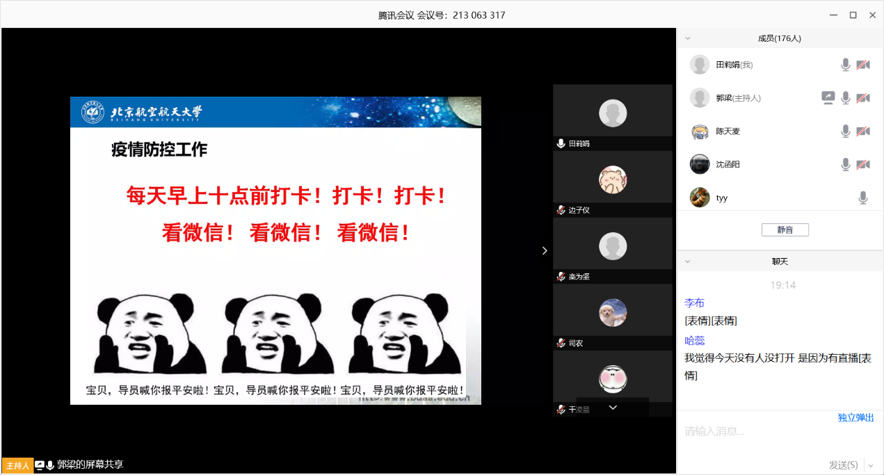 田莉娟导员对大班会进行了总结,就班会上的几个重点事项再次进行强调,并回答了聊天室中大家提到的几个问题。田导还展示了前段时间向大班同学们收集到的为湖北以及武汉加油的素材,有文字、有书法、有视频,鼓励大家做好疫情防护和线上学习、坚定战胜疫情的信心。