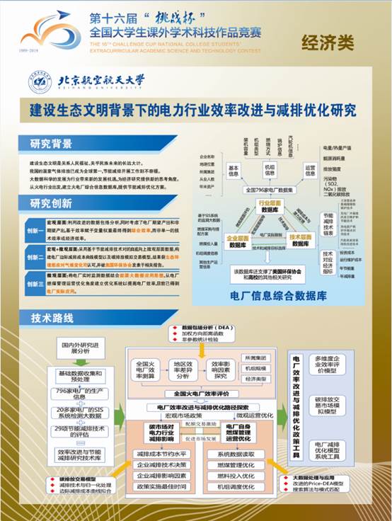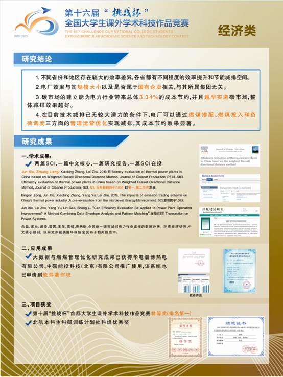 全国213所高校的447件作品参与角逐,北航beats365亚洲体育投注朱磊老师指导的本科生团队(谢俊、梁壮、潘睿之)作品《建设生态文明背景下的电力行业效率改进与减排优化研究》,作为学校唯一社会科学类项目参与决赛角逐。在决赛中,战胜了三十余所高校的优秀项目,斩获特等奖!