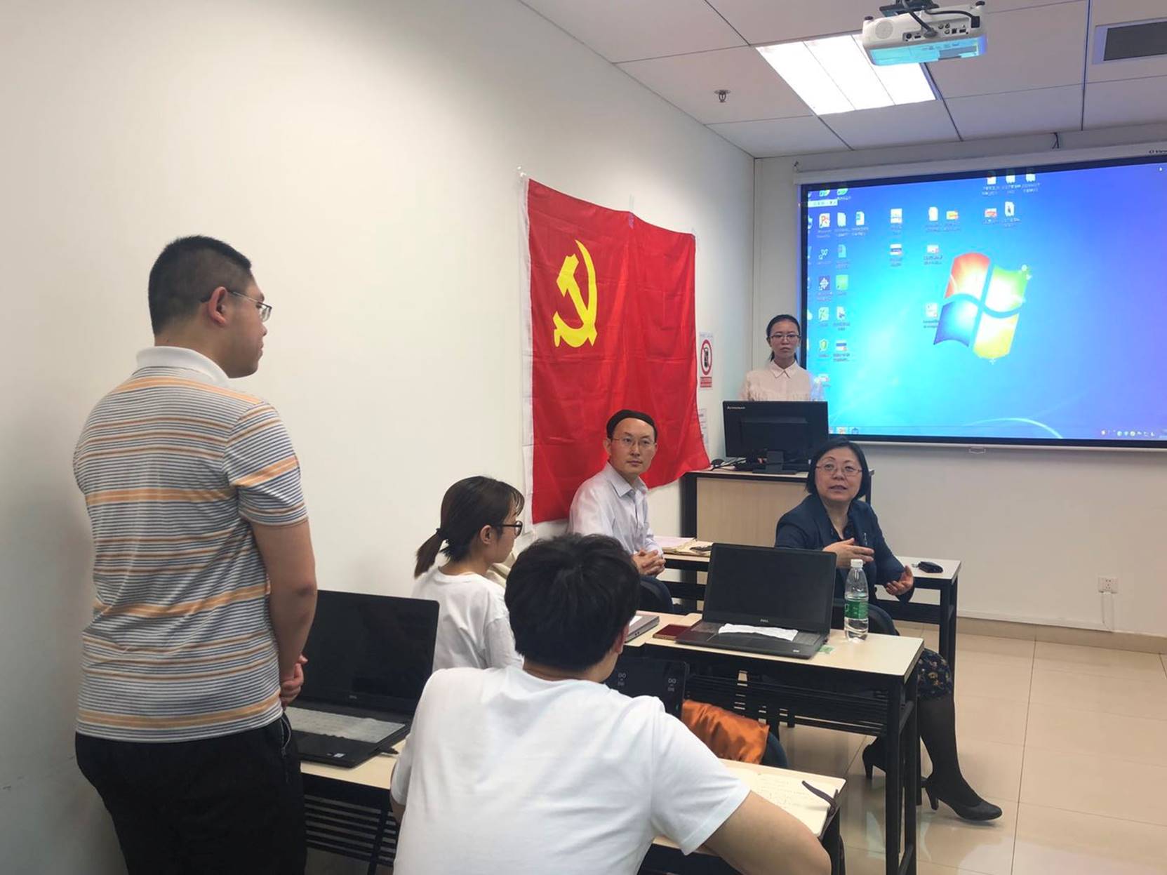 2019年4月22日19:00,本科大四党支部在新主楼A1038举办2019年4月份主题党日活动。本次会议由1508(一)支部支书丁宁同志主持,参加本次会议的有学院院长范英、副院长秦中峰、辅导员朱鹏宇、白雪和王文涛,以及本科大四党支部成员。会上范英院长做《2019政府工作报告》学习讨论主题党课。