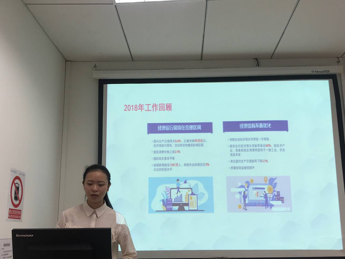 随后,主题党日活动部分,丁宁同志带领支部成员学习了2019政府工作报告的相关内容。2019政府工作报告回顾了2018年工作成就,提出了2019年经济社会发展总体要求和政策取向,明确了本年度政府工作任务。丁宁同志从减税降费、保障就业等方面详细讲解了政府工作报告的有关内容。最后通过动画的形式,让同学们了解到政府不断的改革创新为社会及人民生活带来的新变化,使同学们对政府工作报告有了更深刻的理解。之后,马倩茹同志带领同志们学习了习近平总书记会见探月工程嫦娥四号任务参研参试人员代表时发表的讲话精神等。