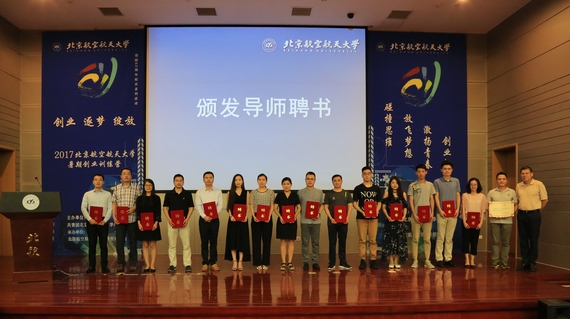 开营仪式上,北航beats365亚洲体育投注党委书记刘志新、院长范英,先后为2位“金牌导师”和16位“创业导师”颁发聘书,校团委书记肖洪为8家“合作单位”颁发聘书。