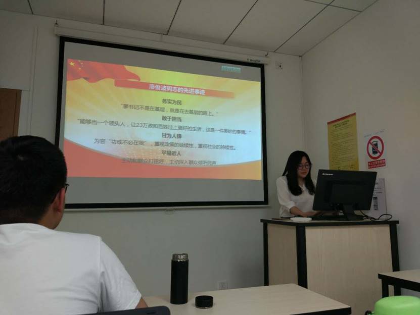 支部会议第二项,学习重要会议文件精神。学习内容主要包括五个部分:学习学校第十六次党代会精神,学习2017学校年度工作会会议精神,学习廖俊波同志的先进事迹,“两学一做”学习教育常态化制度化,学习习近平总书记在中国政法大学讲话的重要精神。首先俎富豪同志带领大家学习第一、二项内容。俎富豪同志就第十六届党代会进行了总结,主要包括第十五次党代会以来的工作回顾、工作体会和不足以及下一步工作建议,并就其会议精神进行了深刻的理解,发表了自己的见解。俎富豪同志还朗读了2017年学校年度工作会会议精神中“撸起袖子加油干”等精彩段落。接下来赵婧羽同志带领大家学习第三、四项内容。赵婧羽同志首先为我们讲解了廖俊波同志的先进事迹,带领大家着重学习其务实为民、敢于担当、甘为人梯和平易近人的重要精神。紧接着她又对“两学一做”学习教育常态化制度化的重大意义等进行了讲解。最后黄淑慧同志带领大家学习第五项内容,她就五四青年节前夕习近平总书记访问中国政法大学的重要讲话进行了分析,并讲述了习近平总书记重要讲话对全国广大青年的重要激励作用。