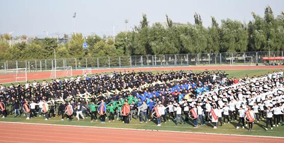 上午9:00,运动会开幕。在国旗护卫队的带领下,27个院系行列式队伍表演了富有院系特色的节目,如,新媒体艺术学院的现场喷漆绘图,飞行学院的飞机行列式造型,高水平运动员队伍的无人机编队等,给在场的观众带来了一场视觉盛宴。时隔两年再次派队参加的国际学院,高举“走进北航,心之向往”的标语走过主席台,将开幕式表演推向了一个小高潮。在经过主席台前时,我院行列式变换为方正的8字型,寓意经管八系。