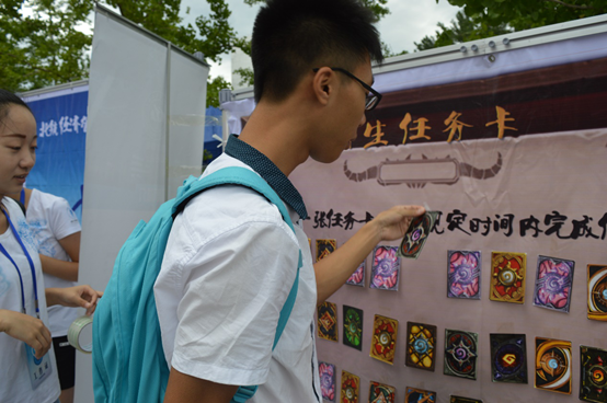 早上六点,梦拓和志愿者们在辅导员的带领下前往”世纪之声”广场进行场地布置,迎新工作于七点半准时开始。为尽可能给新生提供便利,报到处的志愿者们进行一站式作业,把办理入学手续的时间缩短到仅仅一分钟。今年经管学院采取了“游戏式迎新”,其目的是让新生尽早熟悉校园环境:利用游戏中小而有挑战性的目标来激发新生探索校园的热情。