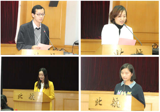 材料学院本科生杨晗同学和经管学院研究生卢竹同学的真挚感言,深切表达了全体获奖同学对中航工业北京航空材料研究院的感谢,和对自身成长的认知、领悟和鞭策。最后,航材院党委副书记王志刚先生的发言,将颁奖仪式升华到了更高的层面。他总结了一代代北航经管学院、材料学院的高材生在航材院的跨越式发展中做出的突出贡献,更期待通过该奖学金的设立,能激励更多北航的材料、管理人才,加入到发展航材院,回报大北航,投身祖国航空航天事业的队伍中来。